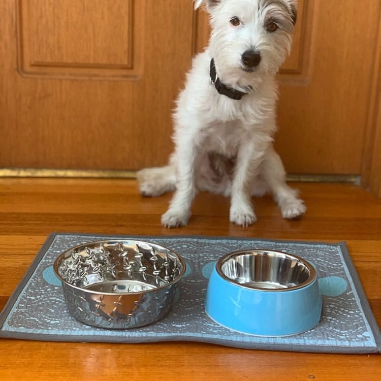 The no-tip, no-spill design includes rubber feet to prevent sliding and noise and to help lift the bowl more easily. There is a crescent-shaped cut-out on one side. Retro Bowls come in 3 retro colours and four sizes to fit any size dog, including extra small for small dogs, pups, kittens and cats.