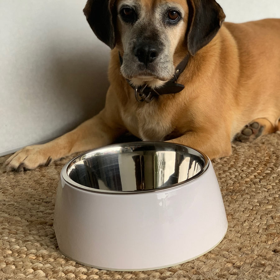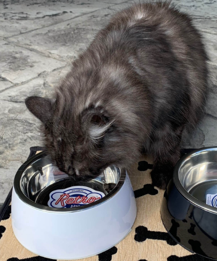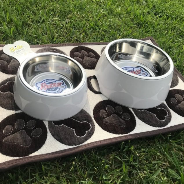 The no-tip, no-spill design includes rubber feet to prevent sliding and noise and to help lift the bowl more easily. There is a crescent-shaped cut-out on one side. Retro Bowls come in 3 retro colours and four sizes to fit any size dog, including extra small for small dogs, pups, kittens and cats.